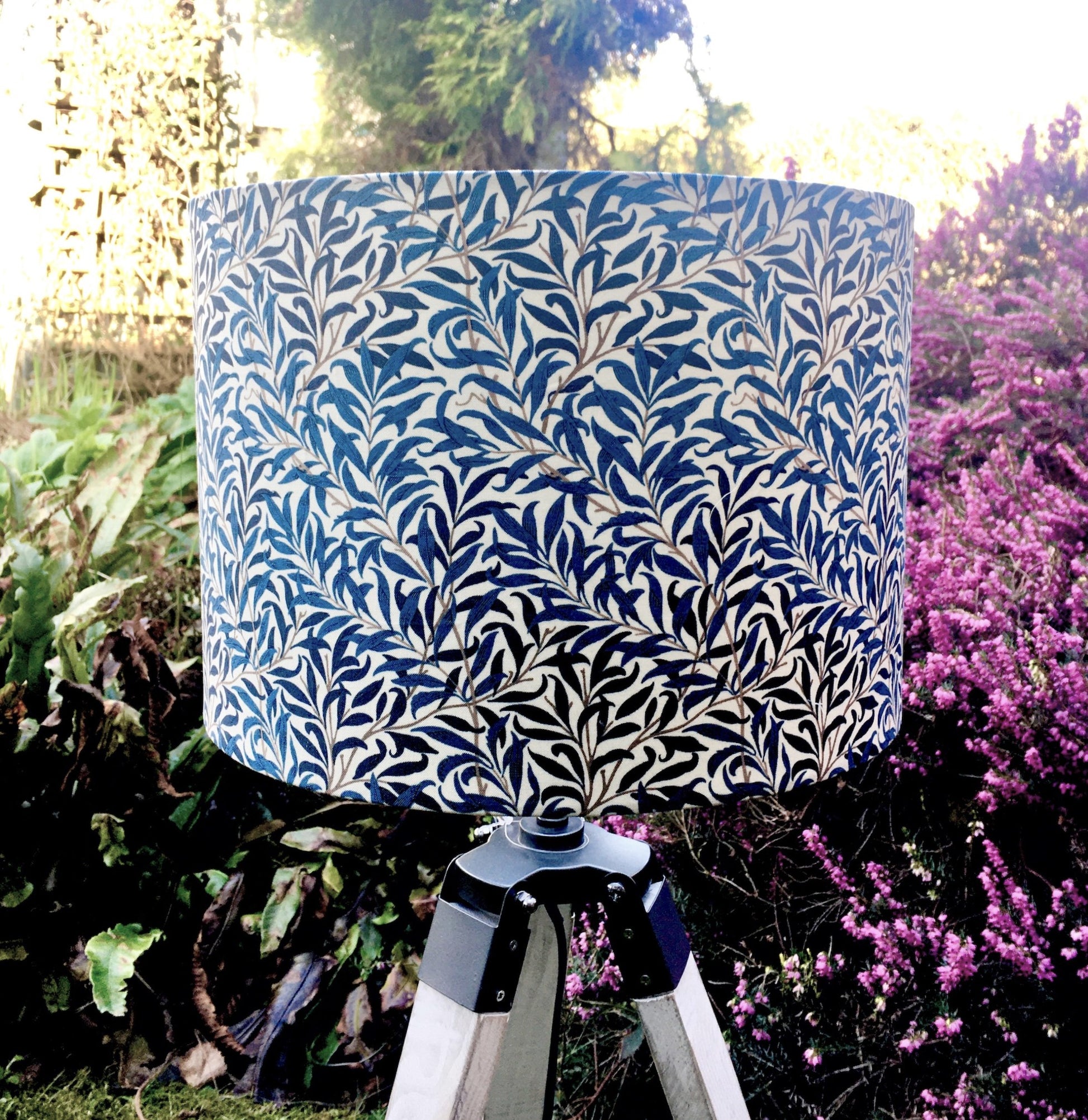 William Morris willow bough fabric lampshade, navy blue colour-way, with a choice of white or metallic lining.